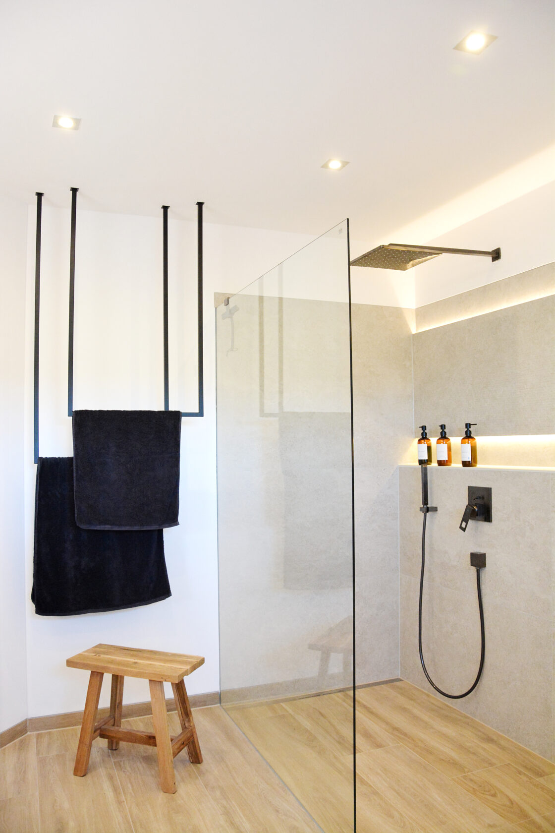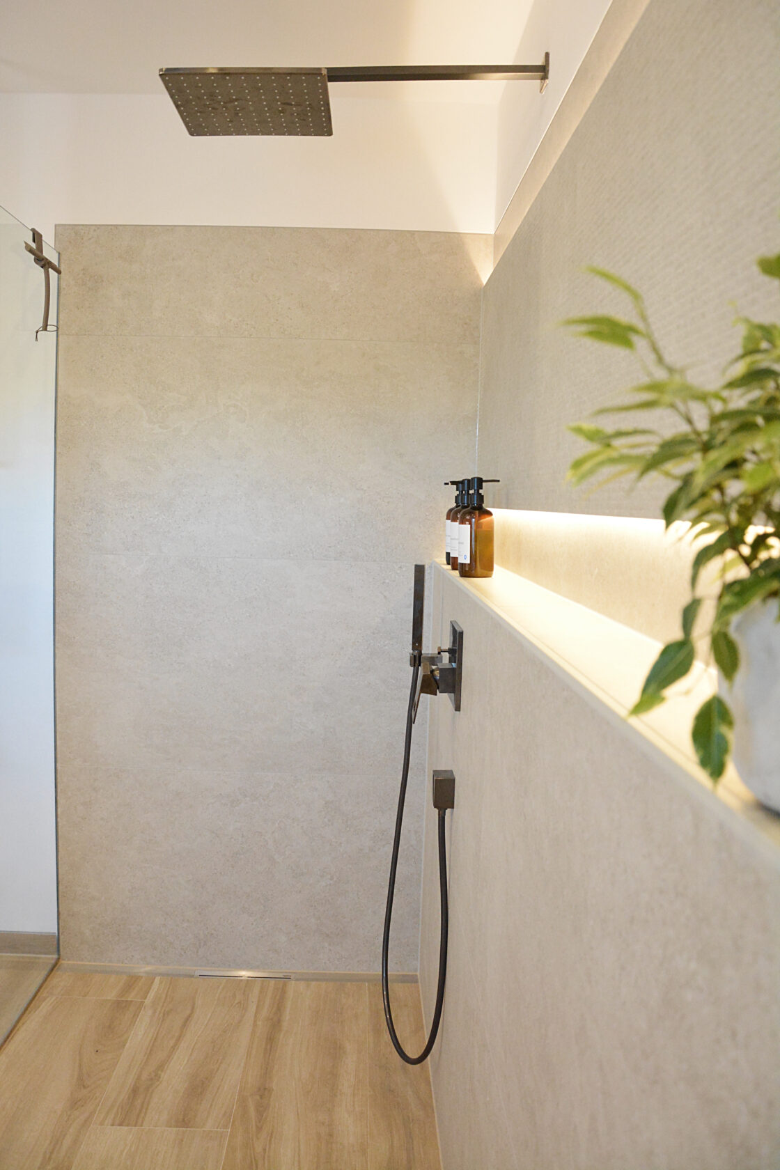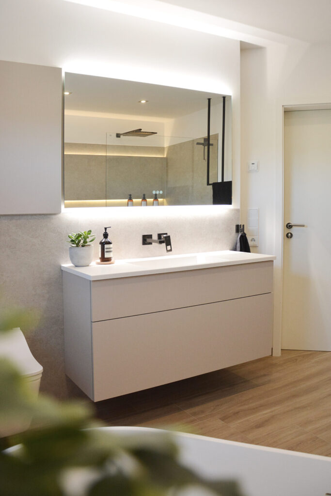 Das Badezimmer mit 9,8 qm erscheint dank des raffinierten Lichtspiels und der Verwendung von Farben in ähnlichen Tönen großzügig. Teile in der Nuance hard graphite verleihen dem Bad einen modernen Akzent.