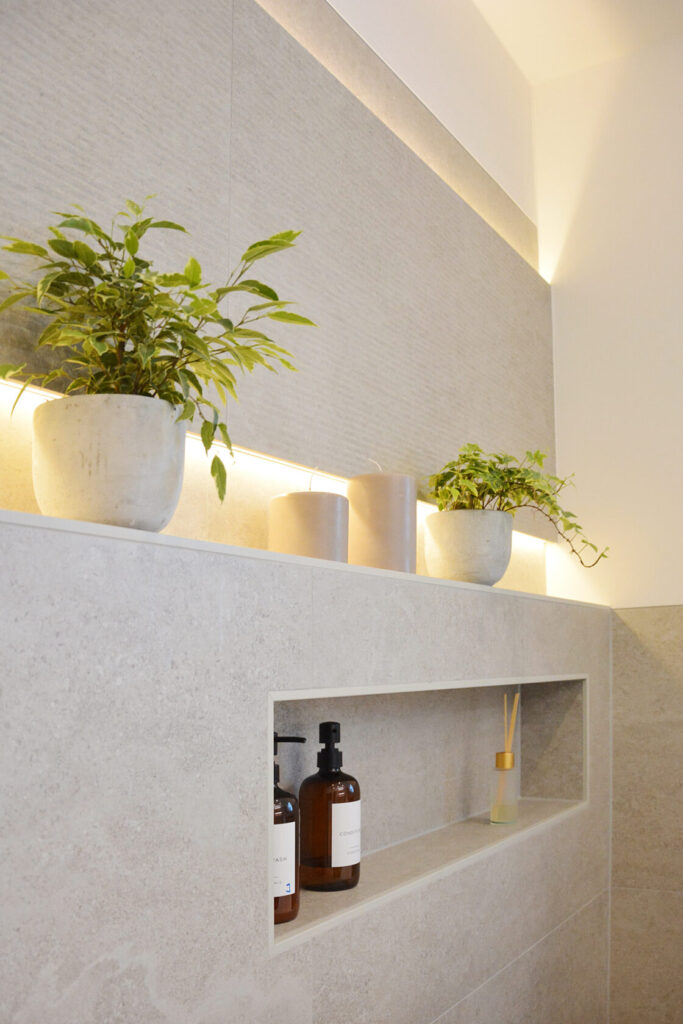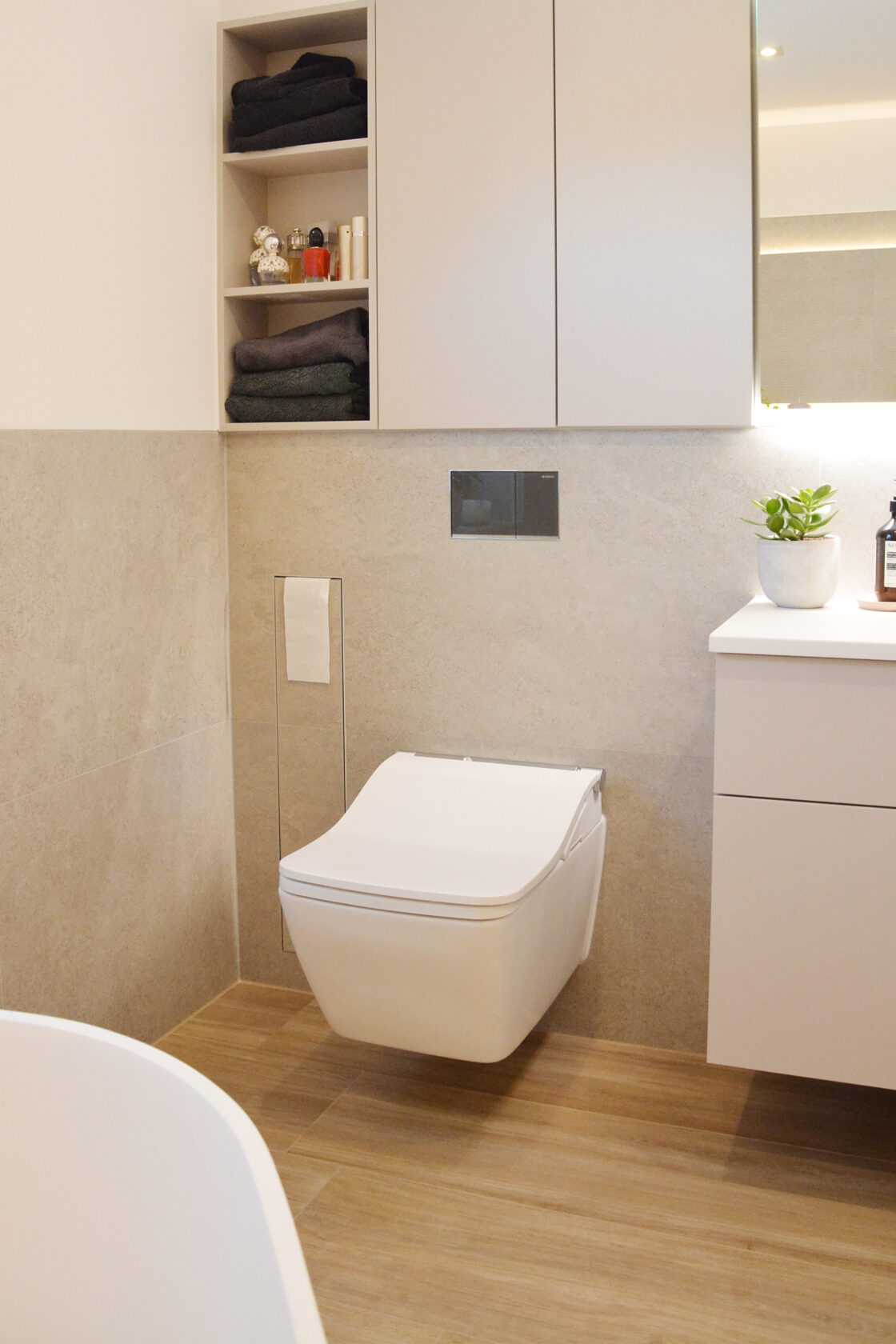 Ein Dusch-WC ist ein unverzichtbarer Bestandteil des modernen Badezimmers. Hier in einer eckigen Form, daneben Accessoires, die in der Vorwand integriert sind.