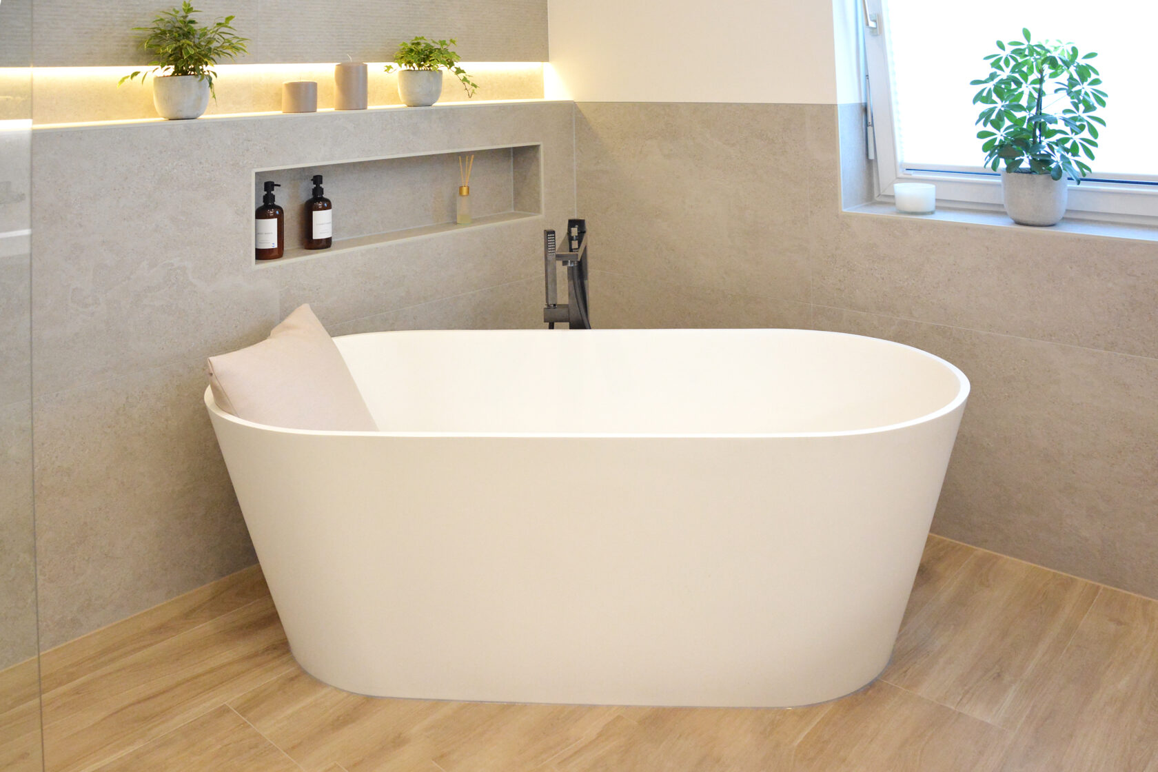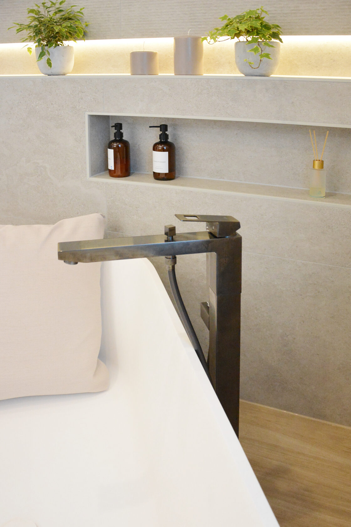 Die bequeme, freistehende Badewanne ist der Blickfang des Badezimmers. Ein passendes Entspannungskissen unterstützt beim Relaxen. Die offene Duschanlage fällt ebenfalls durch ihre Größe und die verwendeten Elemente auf. Die Armaturen aus hard graphite heben sich ausgezeichnet von den großen Wandplatten ab.