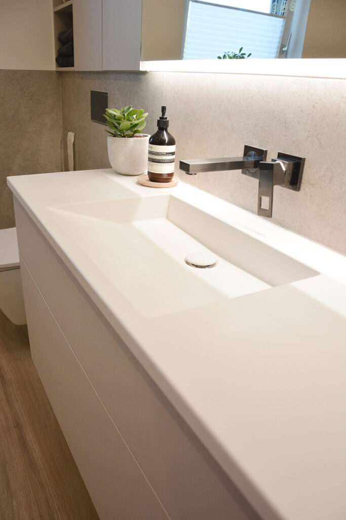 Der Waschtisch ist einfach gestaltet, um sich harmonisch in die restliche Raumgestaltung einzufügen.
