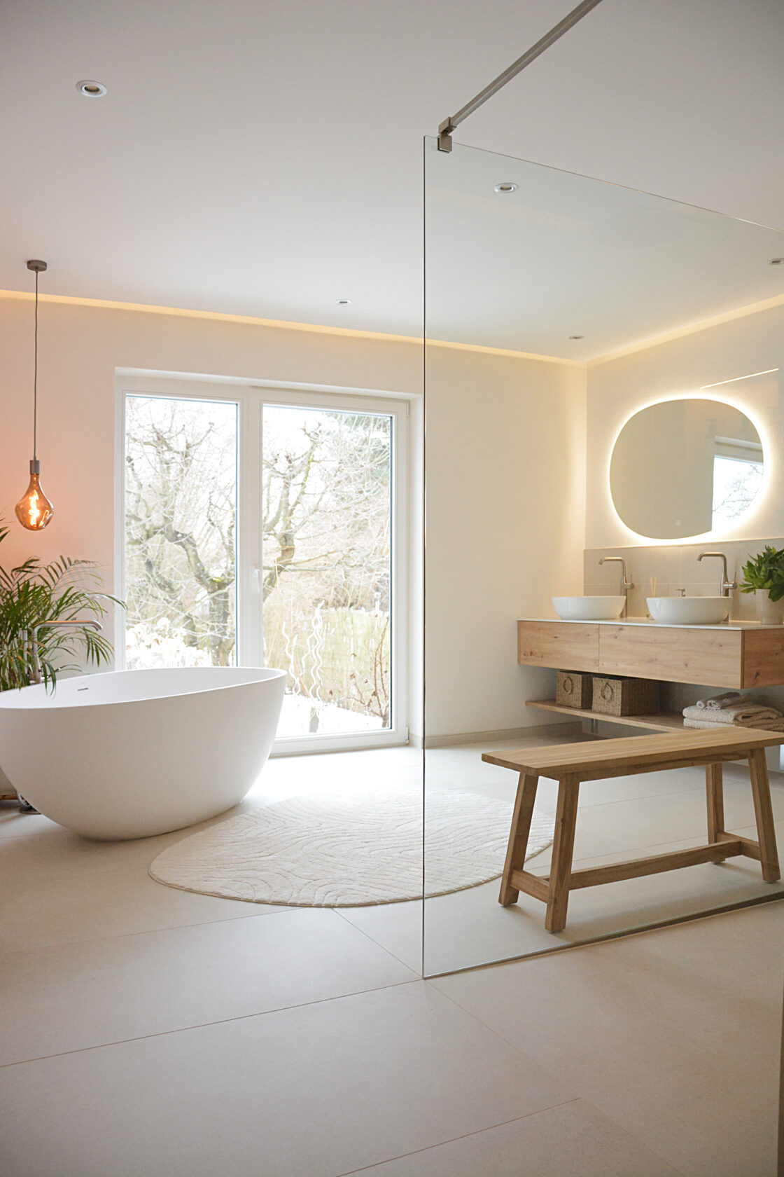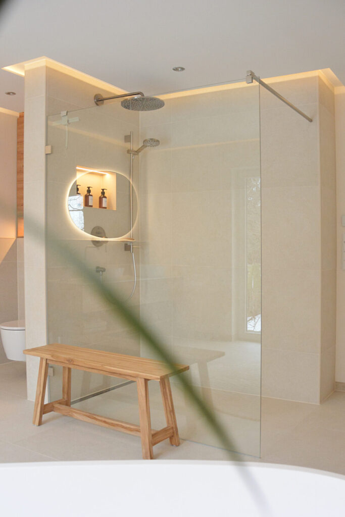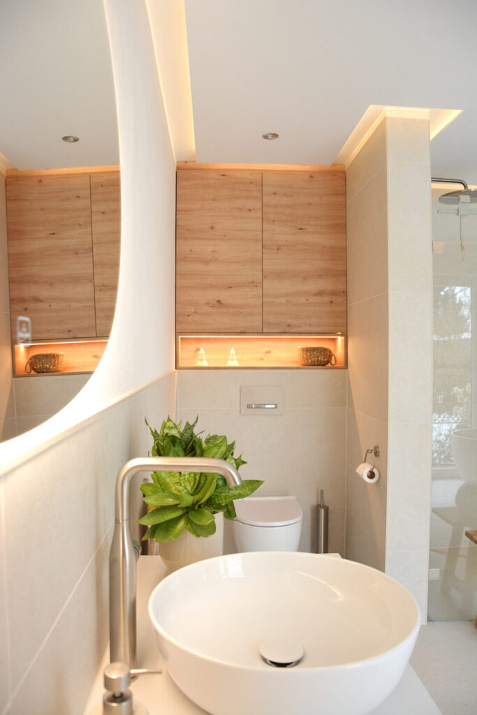 Die indirekte Deckenbeleuchtung sorgt für eine sanfte Grundstimmung. Der hinterleuchtete Spiegel setzt einen ruhigen, architektonischen Akzent und lässt den Raum optisch schweben. Warm abgestimmte Lichtfarben unterstreichen die natürlichen Materialien und verleihen dem Bad eine harmonische, entspannte Ausstrahlung.