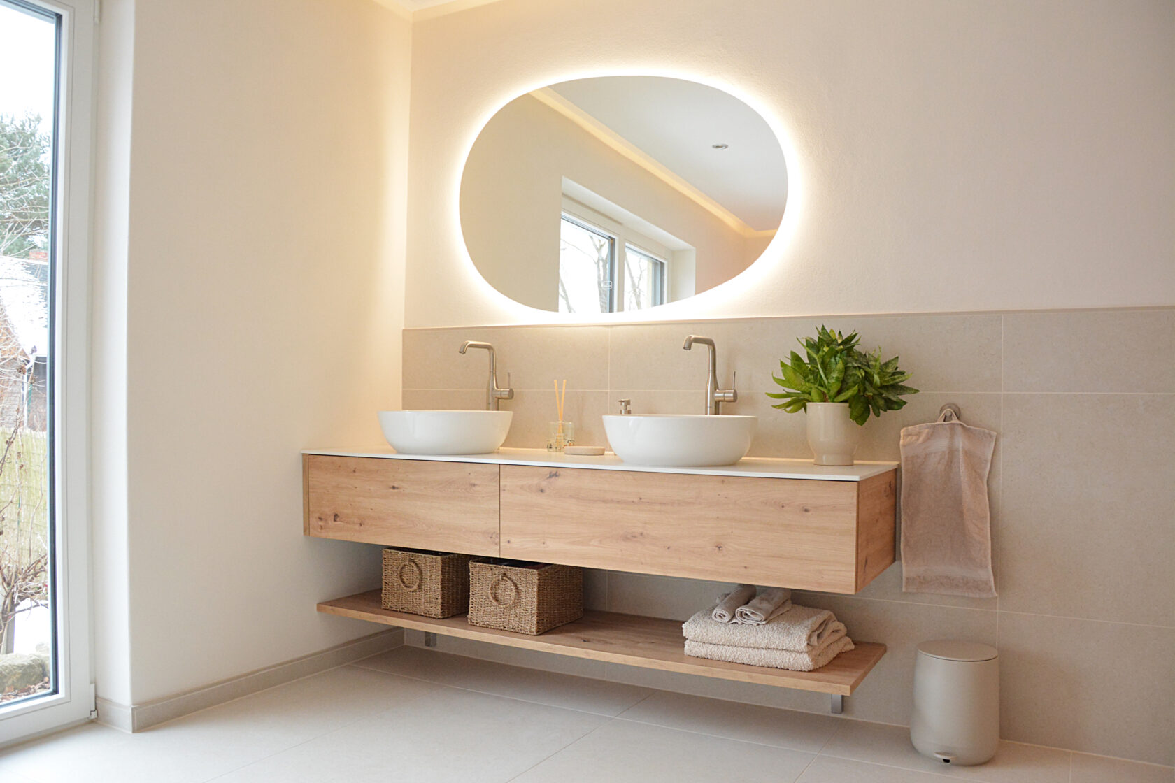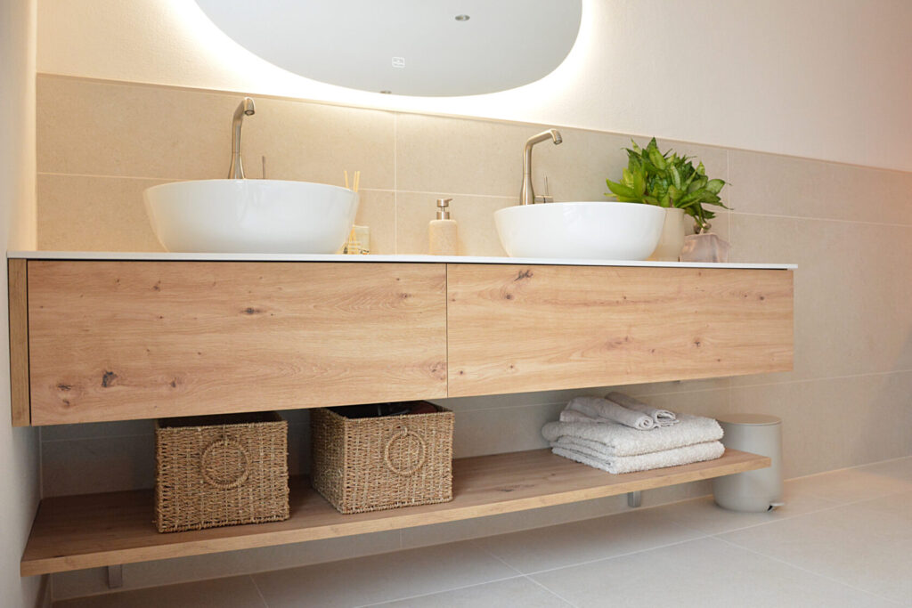Für dieses Bad haben wir bewusst auf natürliche Materialien und eine helle, warme Farbwelt gesetzt. Holzoberflächen, zurückhaltende Naturtöne und präzise abgestimmte Texturen schaffen eine ruhige, zeitlose Atmosphäre.