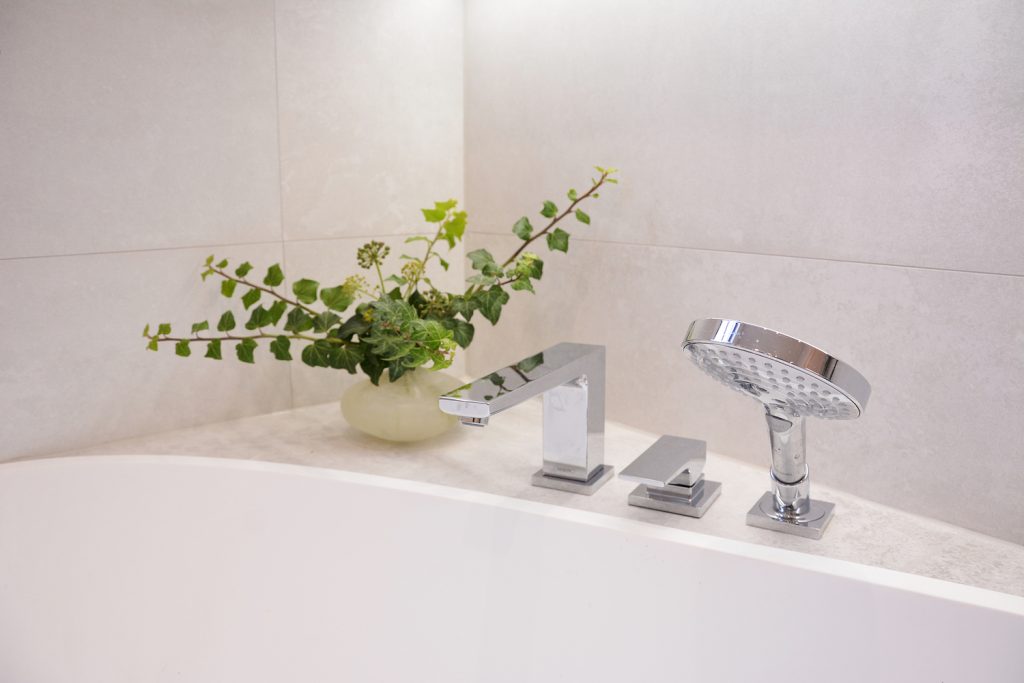 Zum Verweilen lädt die frei stehende Badewanne aus Mineralguss mit angenehmer Beleuchtung ein.